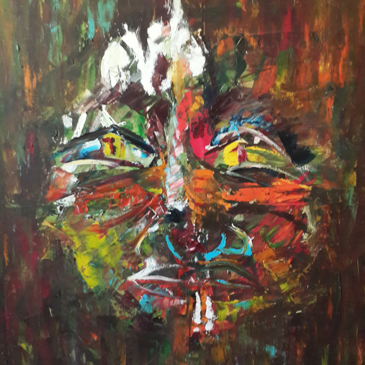 Mask 1Masks Type: Oil painting on stretched canvas. Sides painted. Thick paint texture. Size: 90 * 90 * 1.5 cm (width * length * depth) Weight: 3 kg Utensils: Brushes and palette knife. Year: 2011 Share this: 3, December 2015 Abstract Oil Painter abstract oil painting brown oil painting colorful brown oil painting for sale man smoking painting oil painting for sale oil painting with facial expression painting of a man smoking round face painting